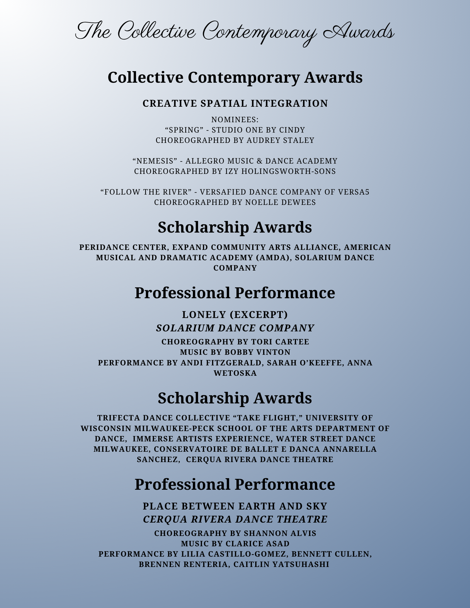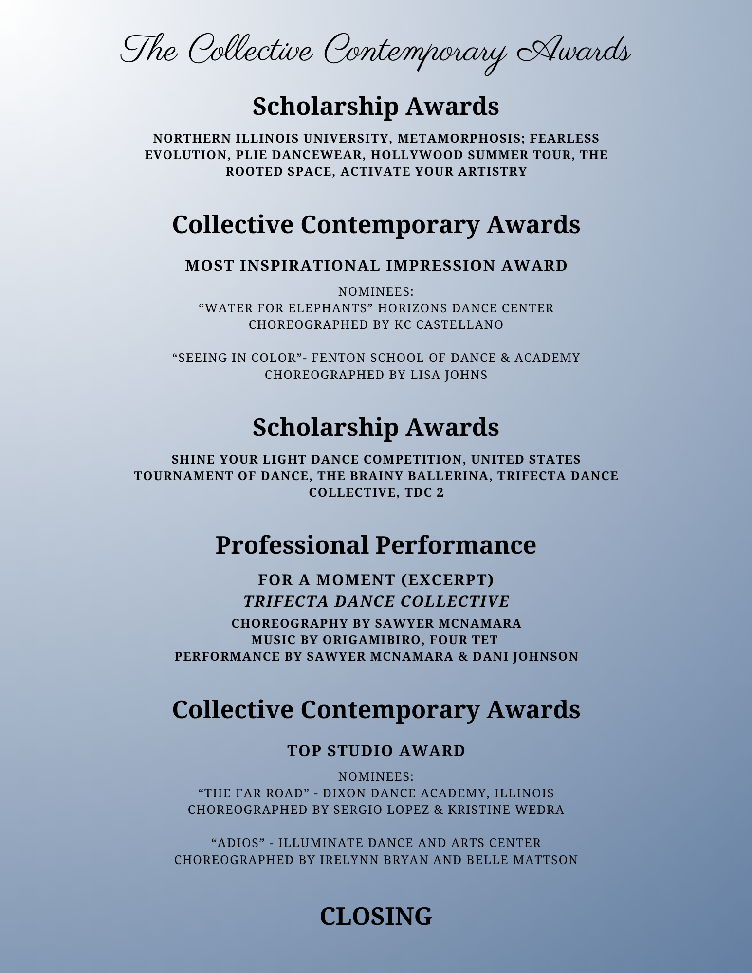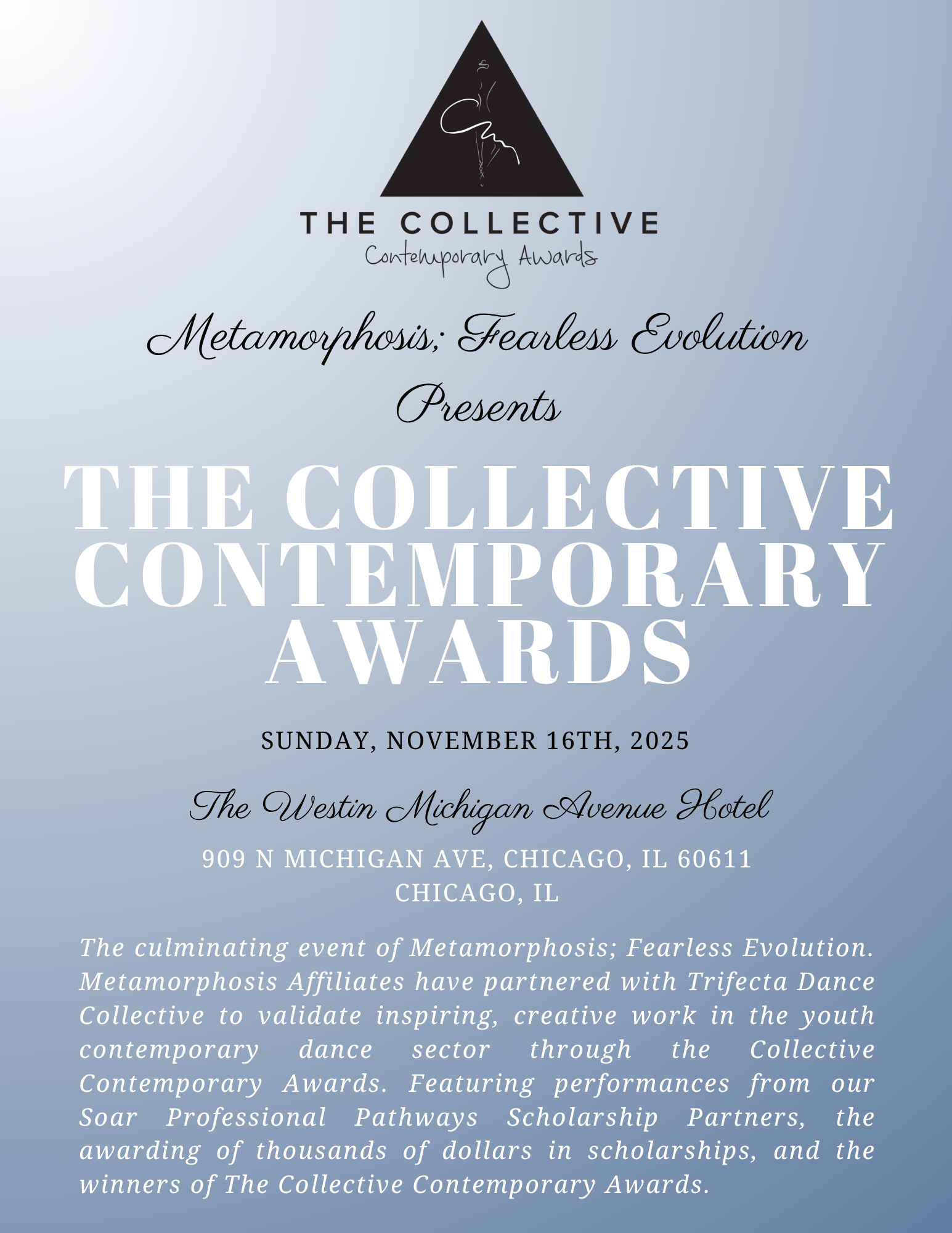 Dancers will be photographed on the red carpet starting at 9:30am at The Westin Michigan Avenue Hotel (909 N Michigan Ave, Chicago, IL 60611) before entering the Collective Contemporary Awards Ceremony, which consists of live performances by Chicago-Based dance companies, Collegiate Dance Departments, and scholarship recipient announcements from our esteemed Metamorphosis Affiliates and SOAR Professional Pathways partners.